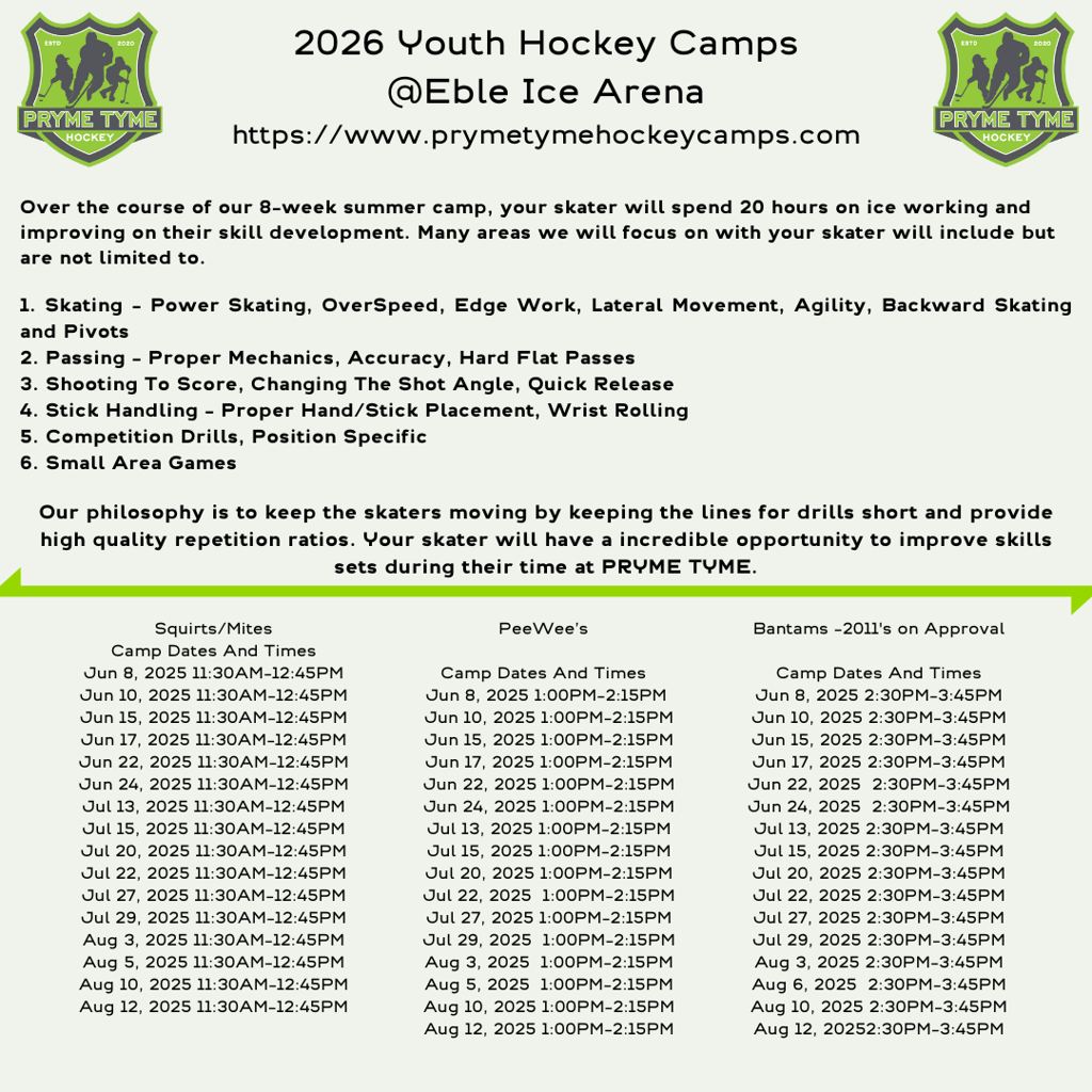 Make sure to add PRYME TYME HOCKEY CAMPS to your training regiment.